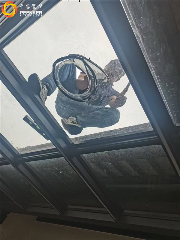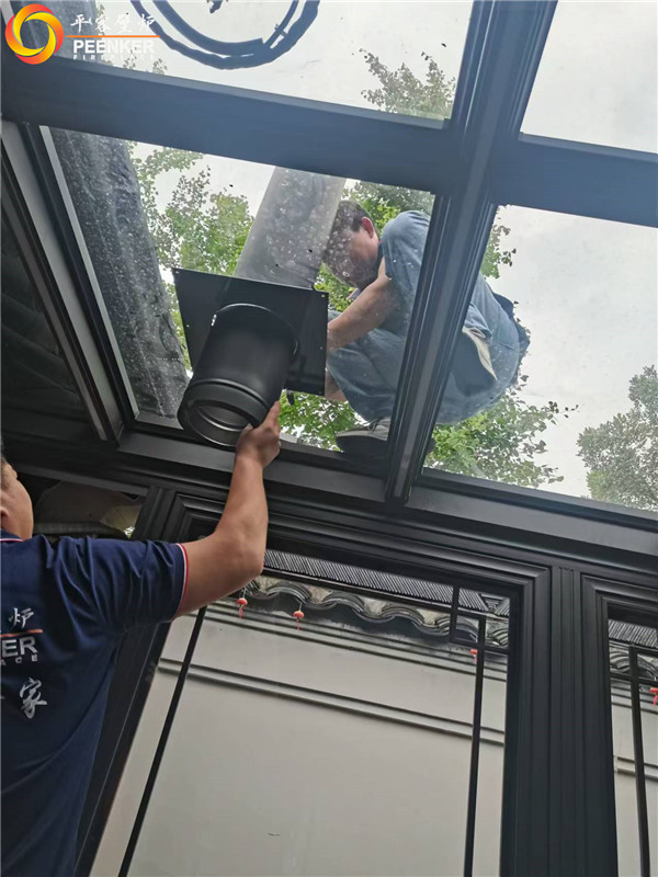 項(xiàng)目介紹:該項(xiàng)目安裝在安吉桃花源別墅中,現(xiàn)場是客戶家的陽光房。對于陽光房中安裝壁爐,事先需要業(yè)主將安裝位置的頂部玻璃讓玻璃廠開好洞口后重新安裝,才可以安裝壁爐煙囪。該項(xiàng)目由【平客壁爐】項(xiàng)目部帶隊(duì)上門安裝。