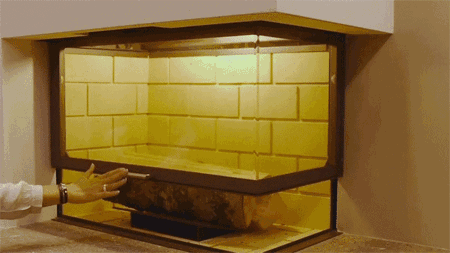 是不是非常巧妙?提拉門不僅能上下滑動,而且居然還能橫向旋轉開啟。這就是充分考慮到大尺寸爐門玻璃的清潔問題而專門設計的。(更多關于提拉式爐門的知識請點擊瀏覽“豪華壁爐為什么采用提拉式爐門?”)