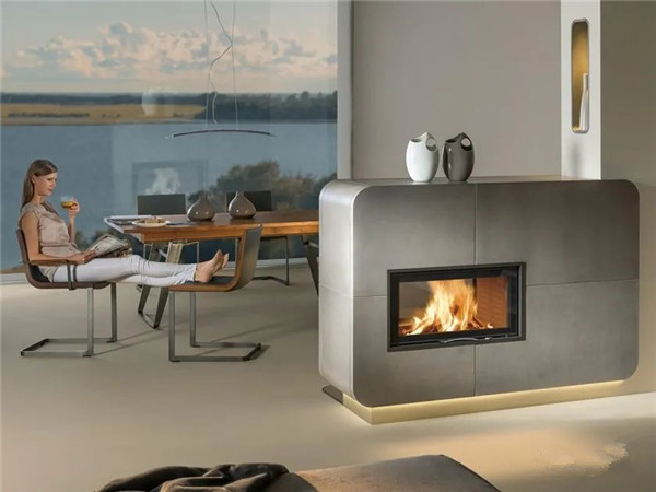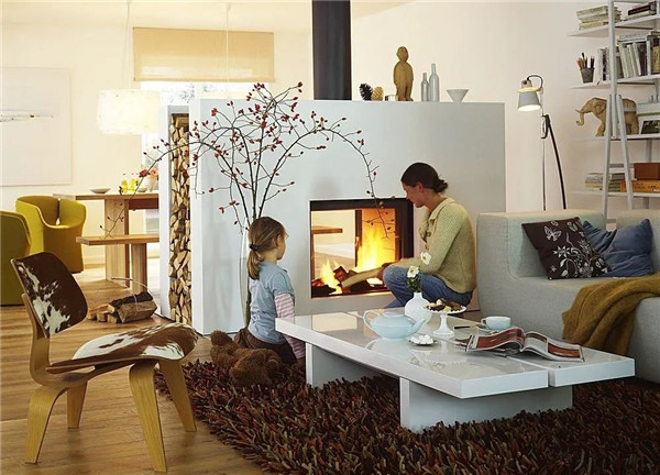 這是一種特殊類型的壁爐,它可以從兩側開門、添柴,能夠同時給兩邊區域供暖,一臺雙面壁爐其實相當于兩臺背靠背安裝的共用一根煙囪的單面壁爐。